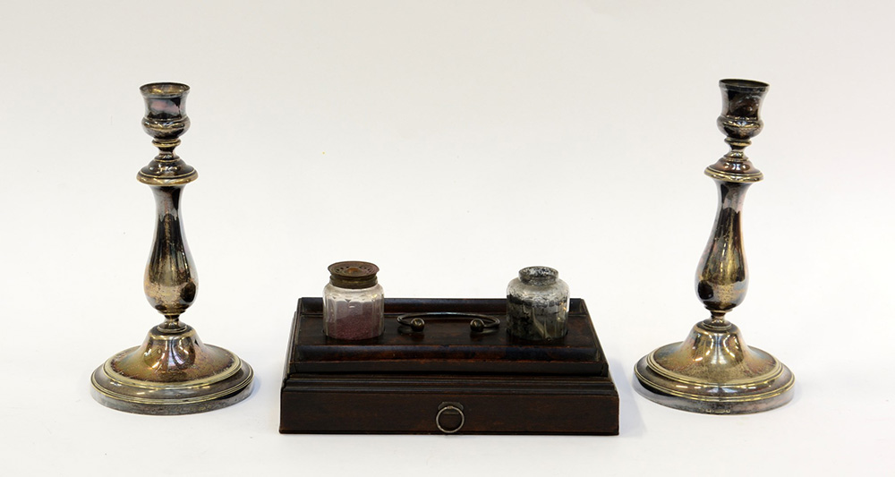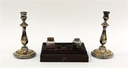 Lotto composto da un calamaio del sec. XIX, due candelieri in metallo argentato marcati Christofle (difetti)