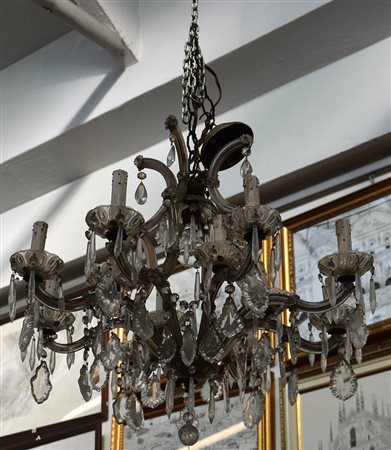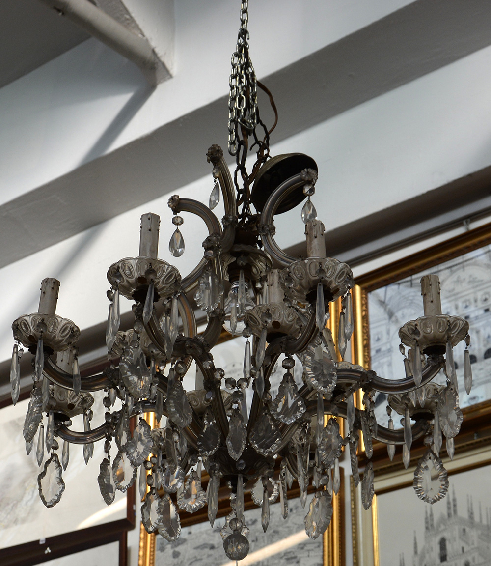 Lampadario a dodici luci in vetro decorato a pendenti (h. cm 70) (difetti)