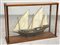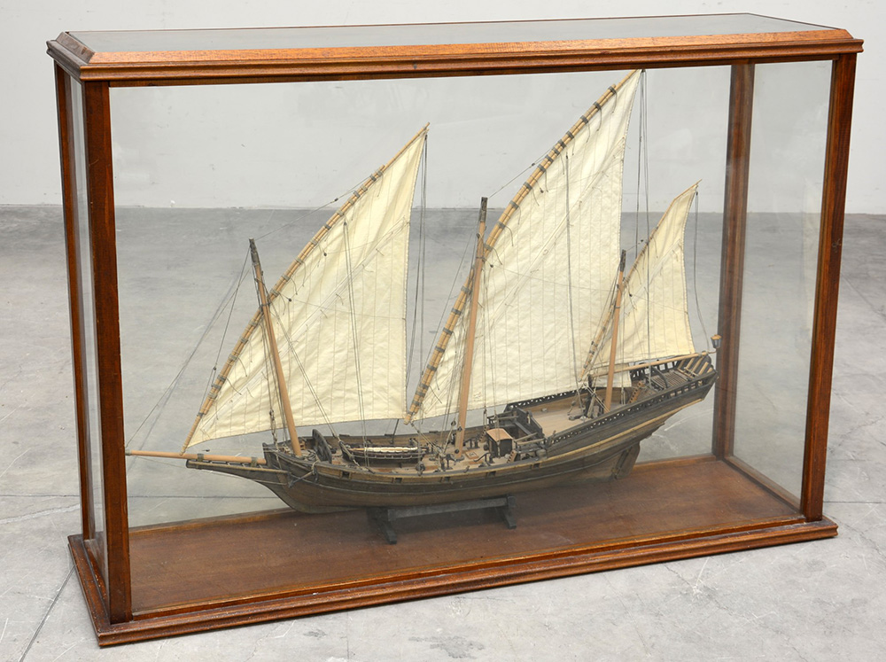 Modello di veliero a tre alberi in legno, contenuto in teca (cm 120x85x34) (difetti)