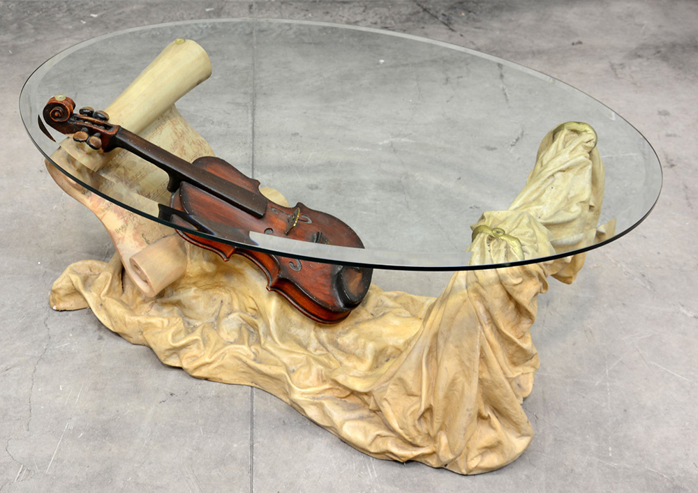 Tavolo da centro con base decorata a trionfo musicale, piano in vetro ovale...