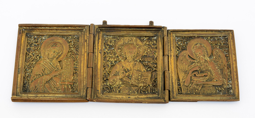 Arte russa. Icona da viaggio tripartita in bronzo (difetti)
