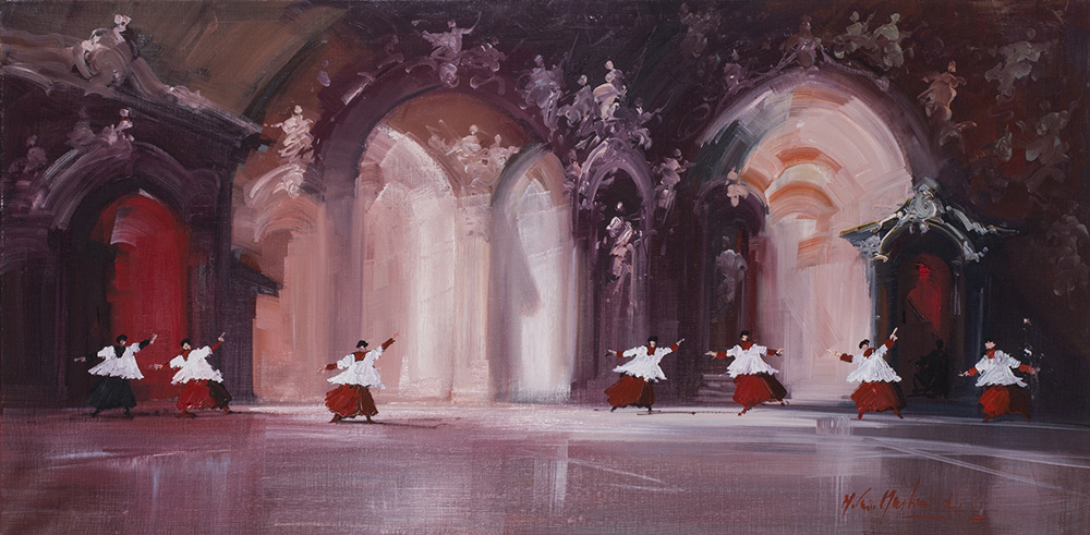 NORBERTO MARTINI (1940-2007) Teatrino Olio e tecnica mista su tela cm 40x80...