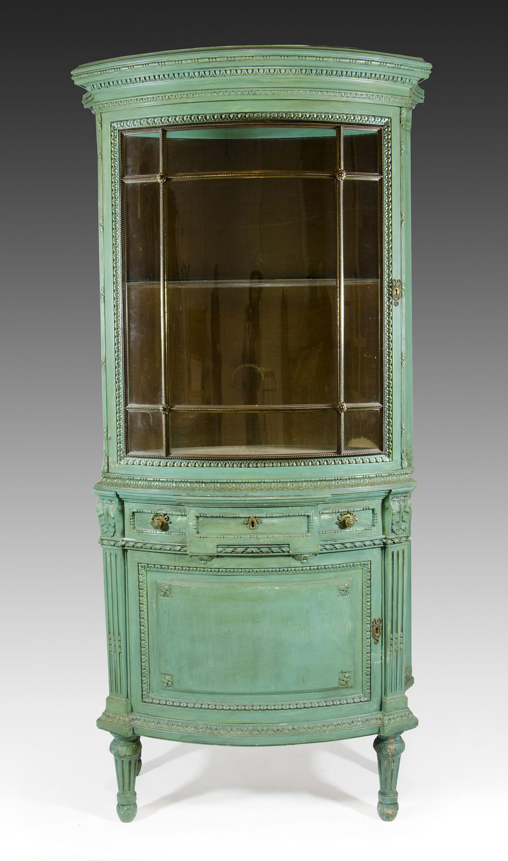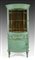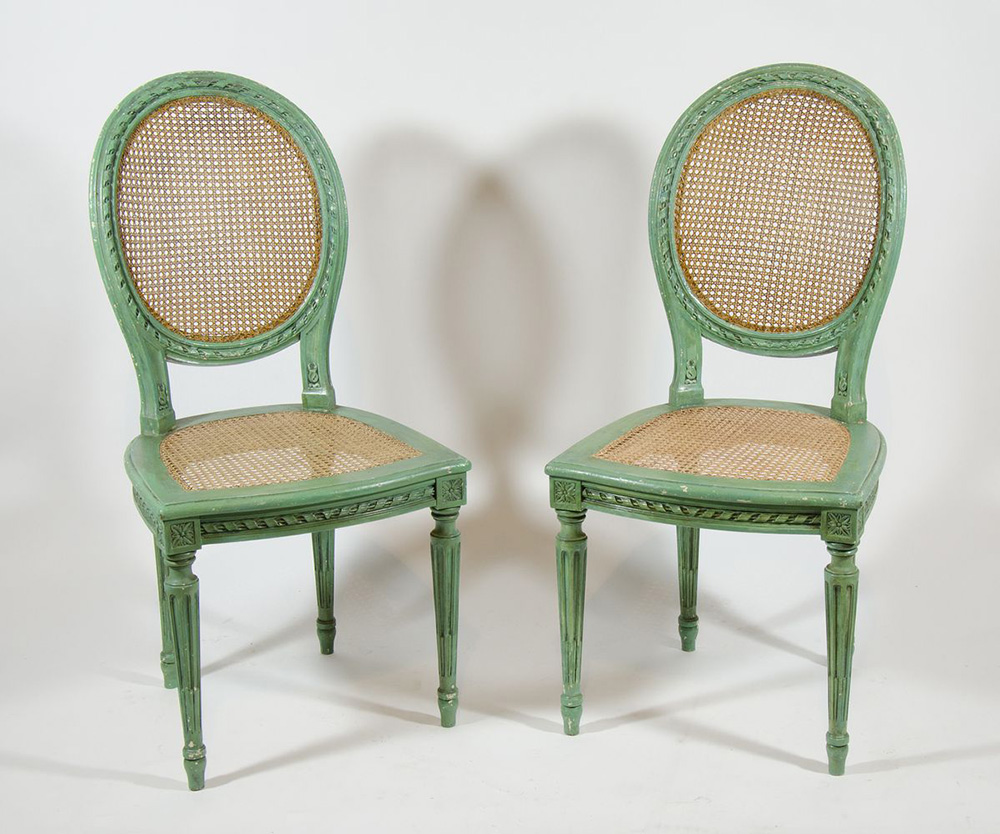 Camera da pranzo in legno dipinto verde composta da grande tavolo, 10 sedie con paglia e coppia di vetrine a 2 corpi.