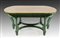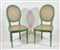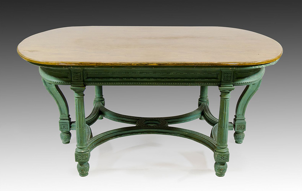 Camera da pranzo in legno dipinto verde composta da grande tavolo, 10 sedie...