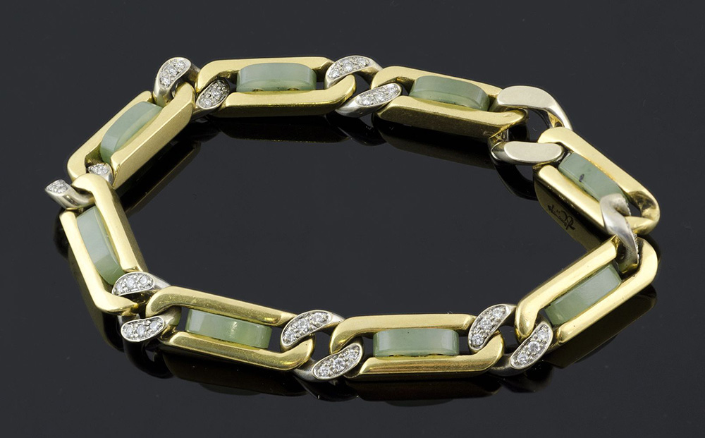 Bracciale semirigido Pomellato in oro giallo con inserti in pietra dura verde e diamanti