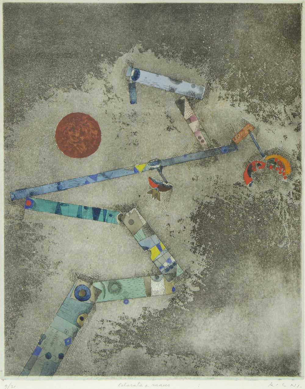 Federico Righi Trieste 1908-1987 "Marchingegno" cm. 42x33 - litografia a colori Firmato b. a d. Esemplare 9/31.