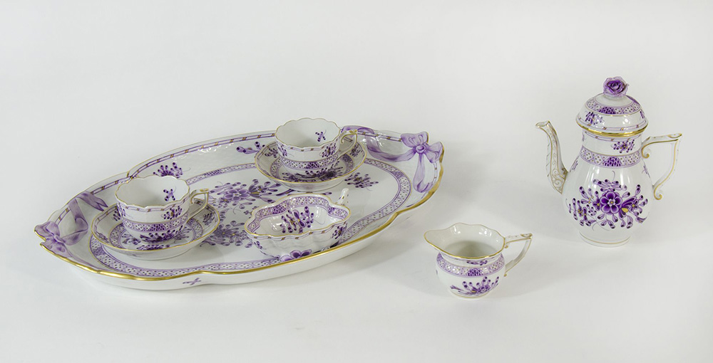 Herend: servizio tete-a-tete in porcellana con decori floreali viola composto da 8 pezzi.