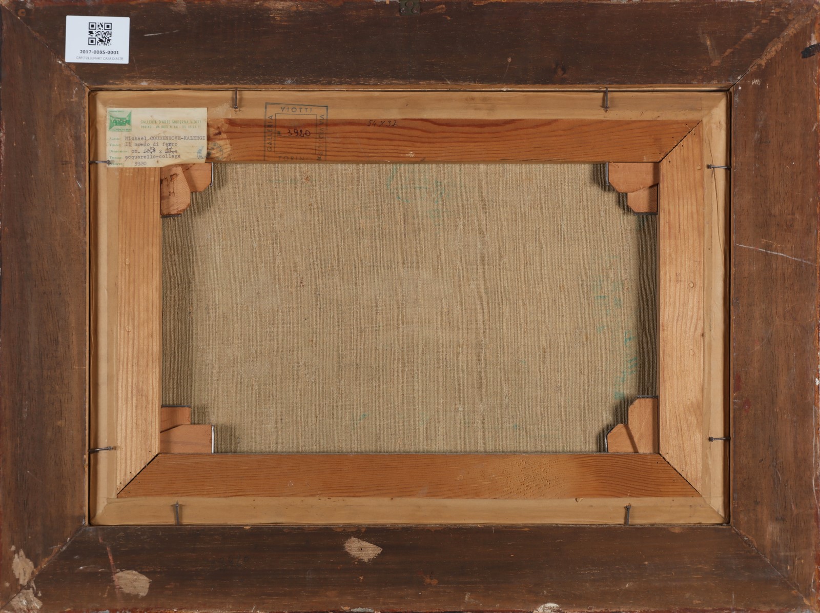 COUDENHOVE-KALERGY MICHAEL (n. 1937) Il mondo di ferro. . 1965. Acquerello e collage su carta. Cm 37,00 x 54,00. Firma e anno in basso a sinistra. Al retro cartiglio descrittivo a cura della Galleria d'Arte Viotti, Torino. Cornice presente