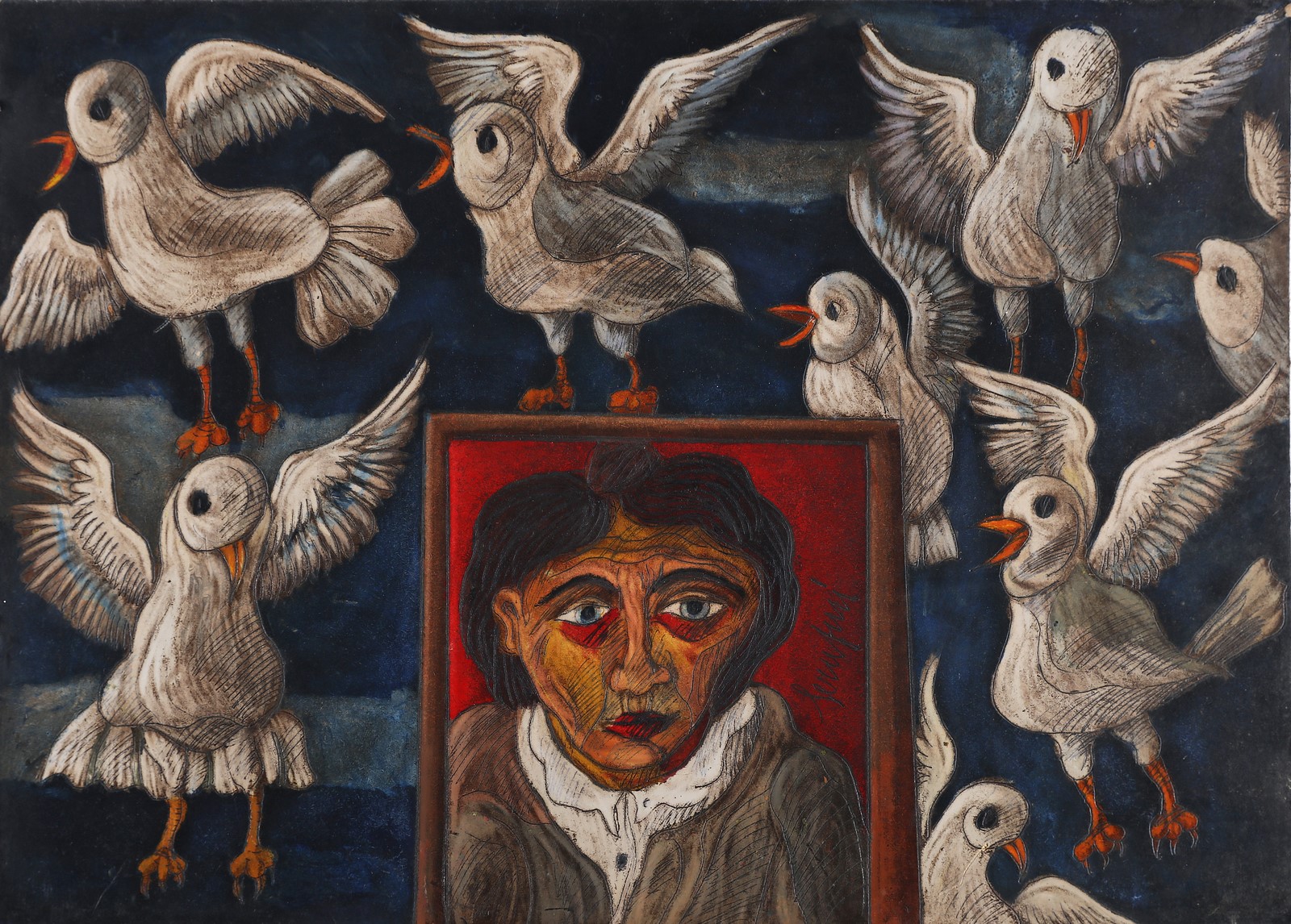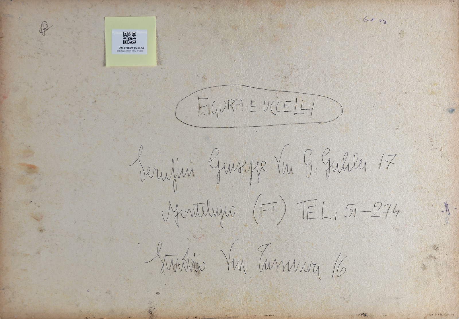 SERAFINI GIUSEPPE (1915 - 1987) Lotto composto da 3 opere. Tecnica mista su cartone. Cm 70,00 x 50,00. 1. Figura e uccelli, firma al centro. Al retro titolo, firma.