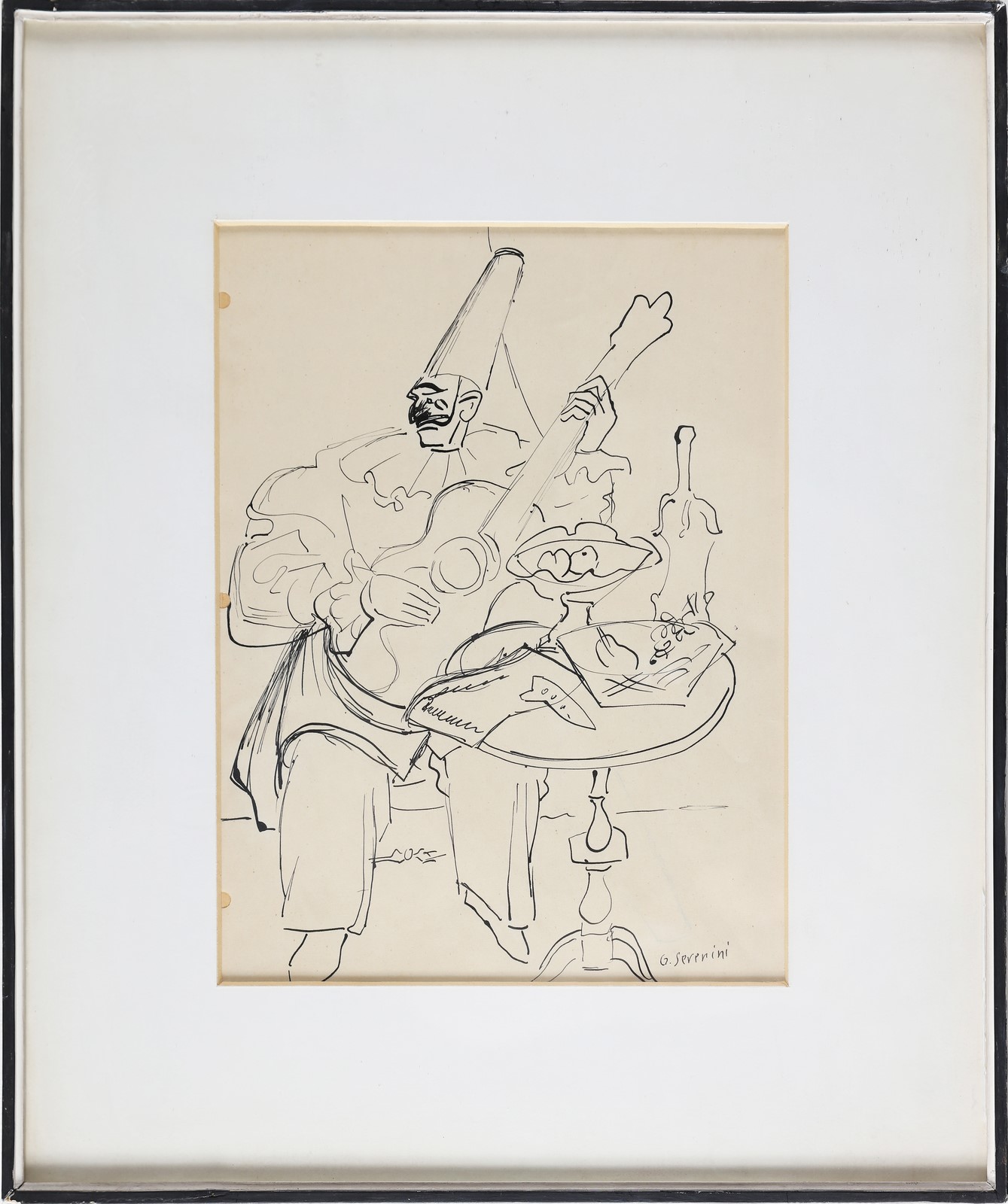 SEVERINI GINO (1883 - 1966) Pulcinella with guitar. 1943. Ink on paper. Cm 21,00 x 27,00. Signed lower right. San Luca Galleria d'Arte Bologna label at the back. Pubblication: Brerarte, auction catalog, 1980 December 15th. Gino Severini Archives at Studio Fonti, Rome, certificate on photo. The work will be inserted in the updating of the edited reasoned catalogue by Daniela Fonti.