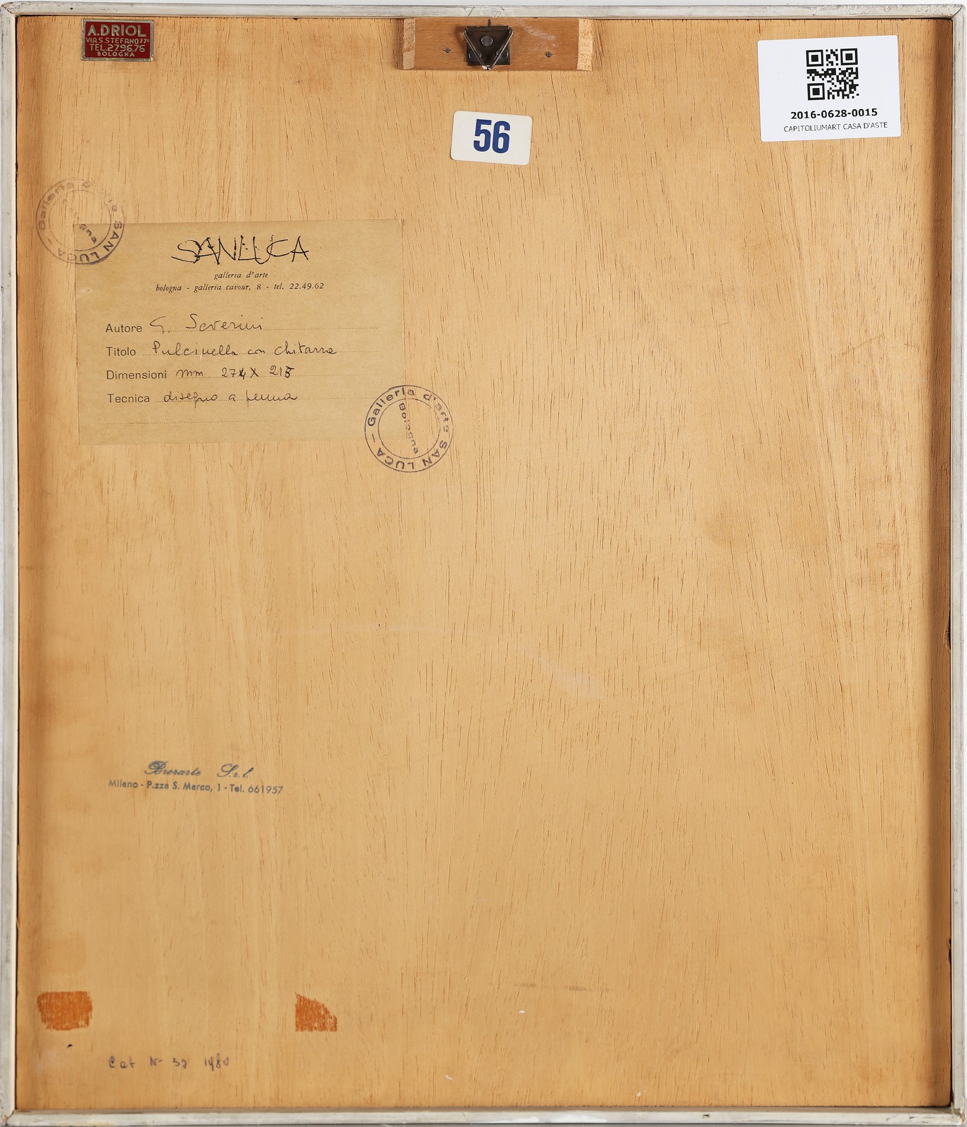 SEVERINI GINO (1883 - 1966) Pulcinella con chitarra. . 1943. China su carta. Cm 21,00 x 27,00. Firma in basso a destra. Al retro cartiglio descrittivo a cura di San Luca Galleria d'Arte Bologna. Pubblicazione: Catalogo Casa d'Aste Brerarte, 15 dicembre 1980. Opera archiviata presso l'Archivio delle opere di Gino Severini a cura dello Studio Fonti, Roma, come da documentazione fotografica allegata all'opera riportante il relativo numero d'inventario. L'opera verrà inserita nell'aggiornamento del catalogo ragionato a cura di Daniela Fonti.