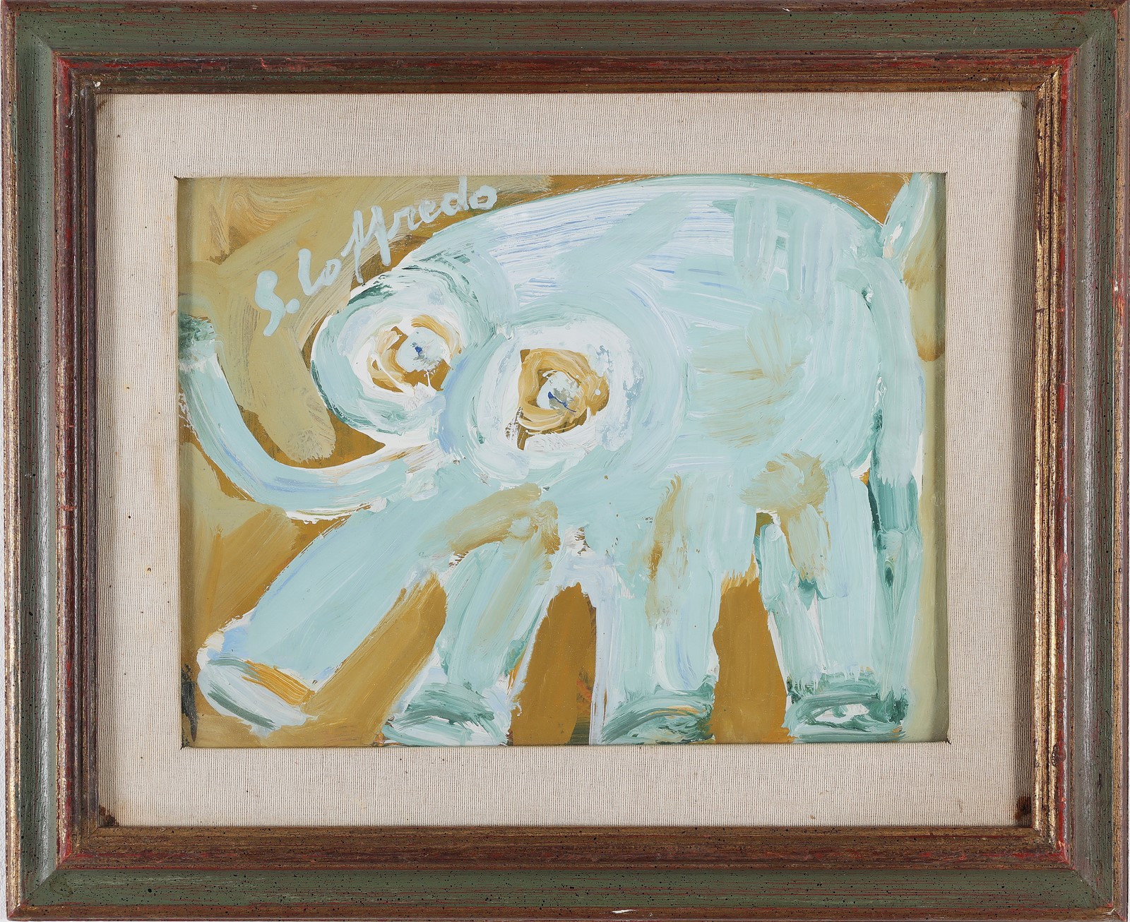 LOFFREDO SILVIO (n. 1921) Elefante. . Olio su tela . Cm 40,00 x 30,00. Firma in alto a sinistra. Al retro firma. Autentica dell'artista su fotografia. . Cornice presente