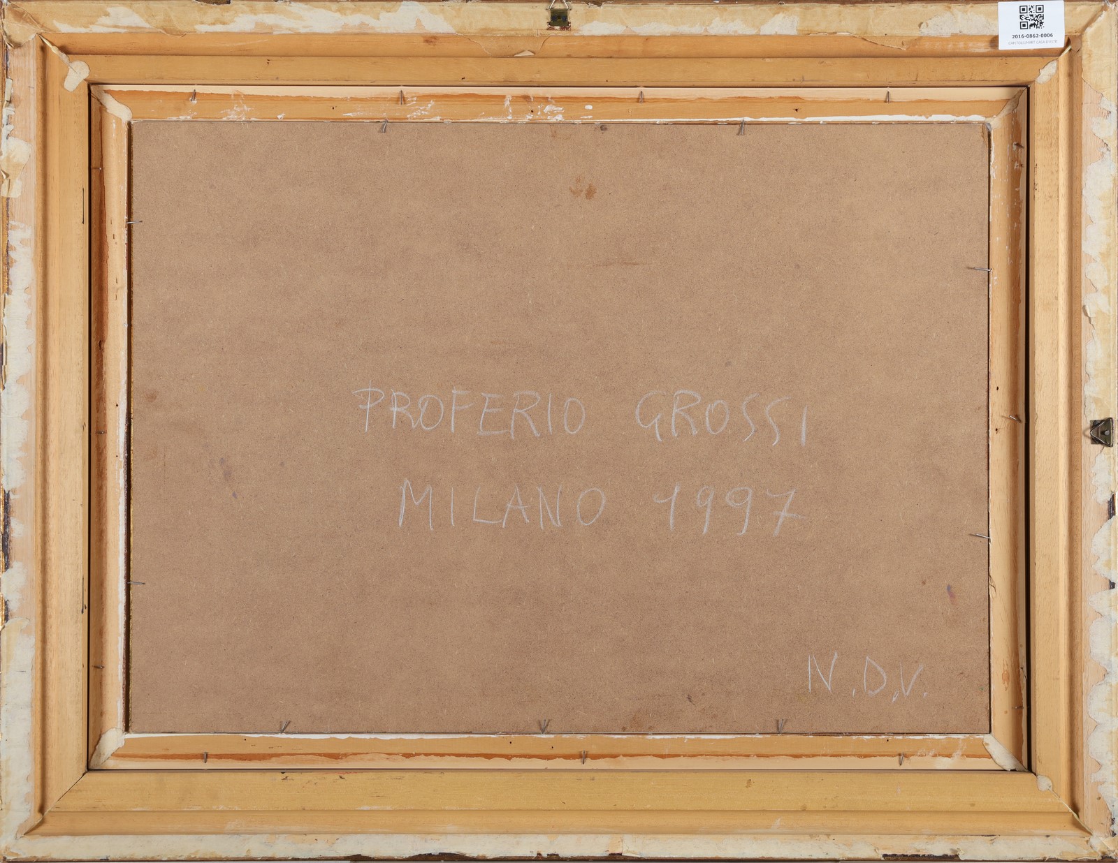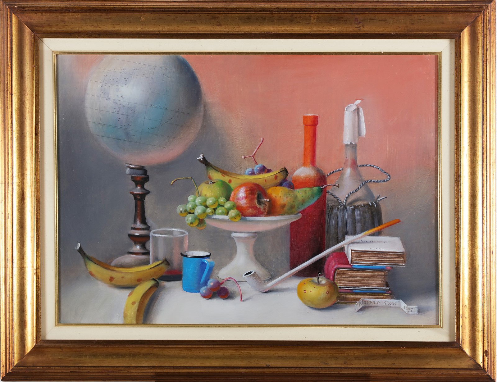GROSSI PROFERIO (1923 - 2000) Natura morta. 1997. Olio su cartone pressato. Cm 70,00 x 50,00. Firma e anno in basso a destra. Al retro titolo, luogo e anno. Cornice presente