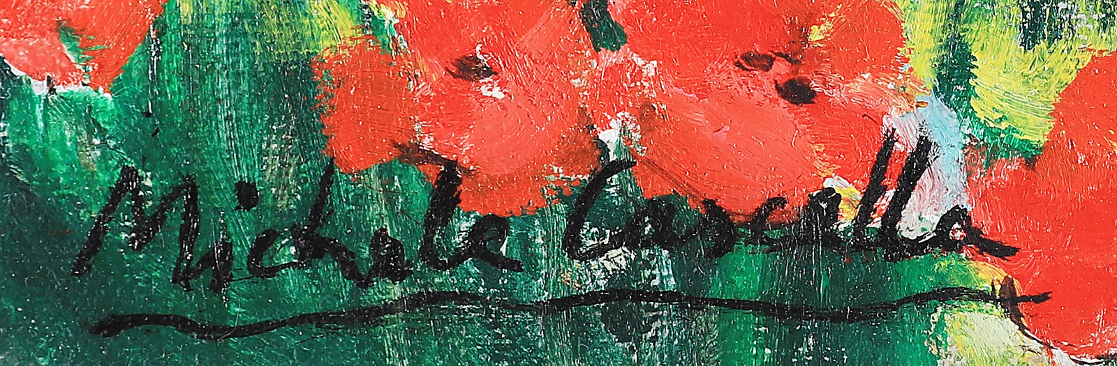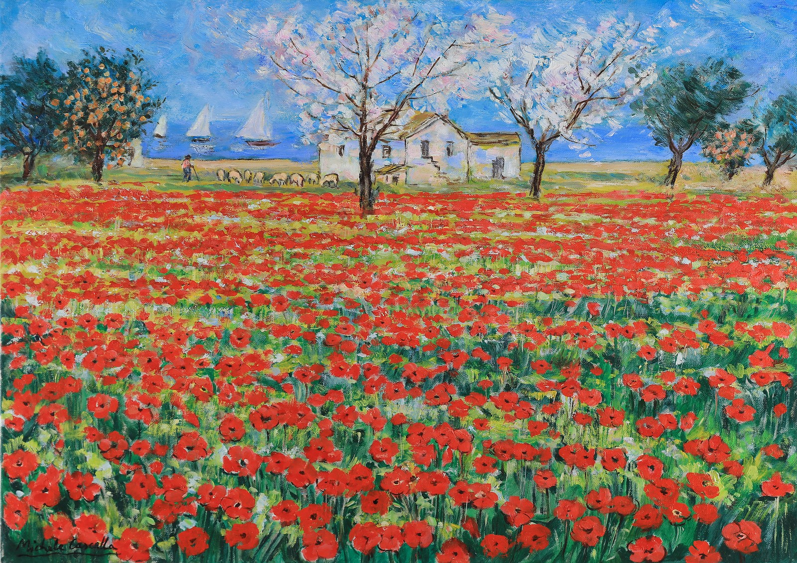 CASCELLA MICHELE (1892 - 1989) Field of poppies. Oil on canvas . Cm 70,00 x 50,00. Signed lower left.Artist's authenticity certificate. Cornice presente