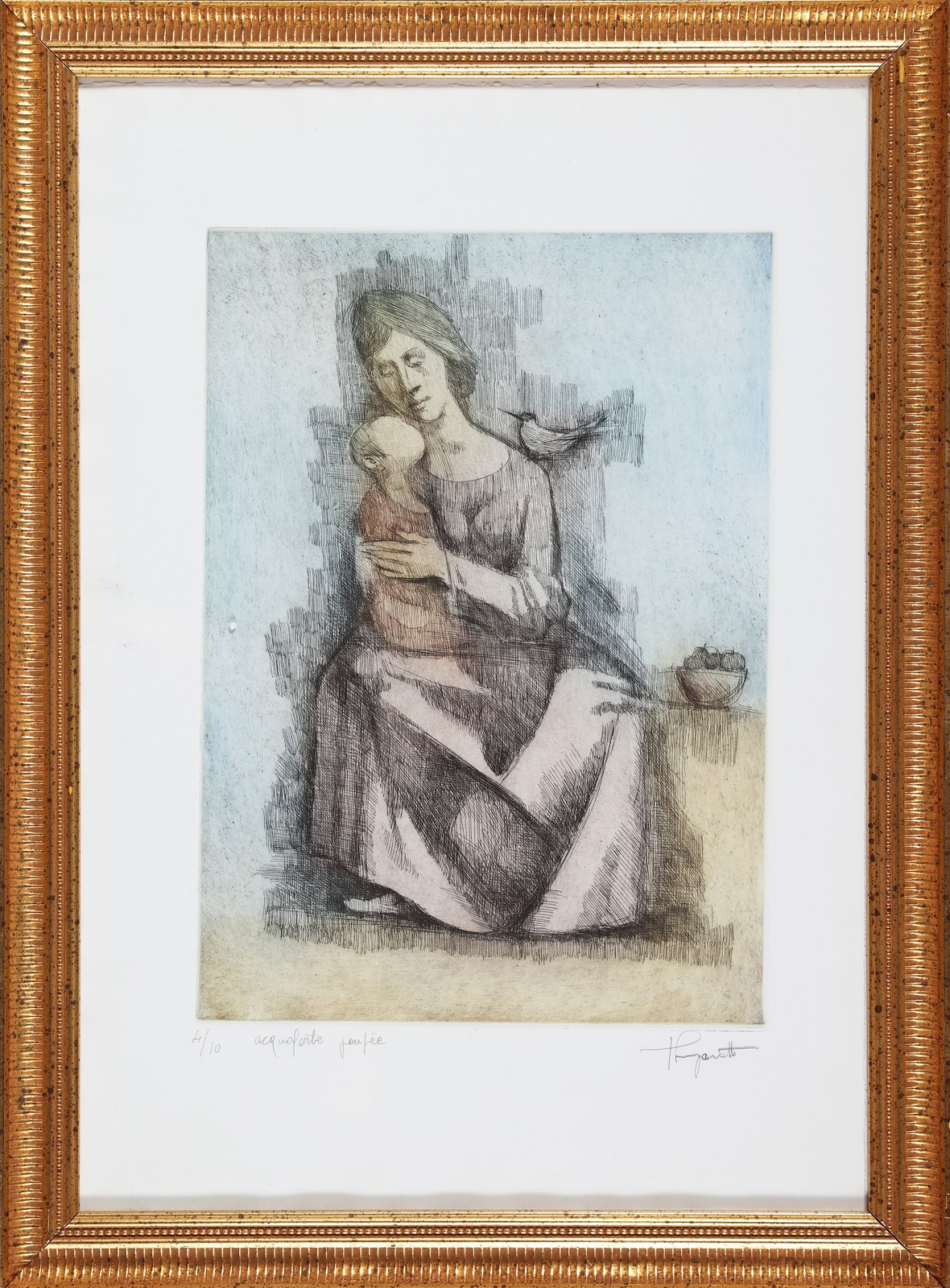 LONGARETTI TRENTO (n. 1916) Donna con bambino. Acquaforte. Cm 35,00 x 50,00. 4/10. Tiratura e firma a matita in basso. Dimensione lastra: 34x24,5 cm. Cornice presente