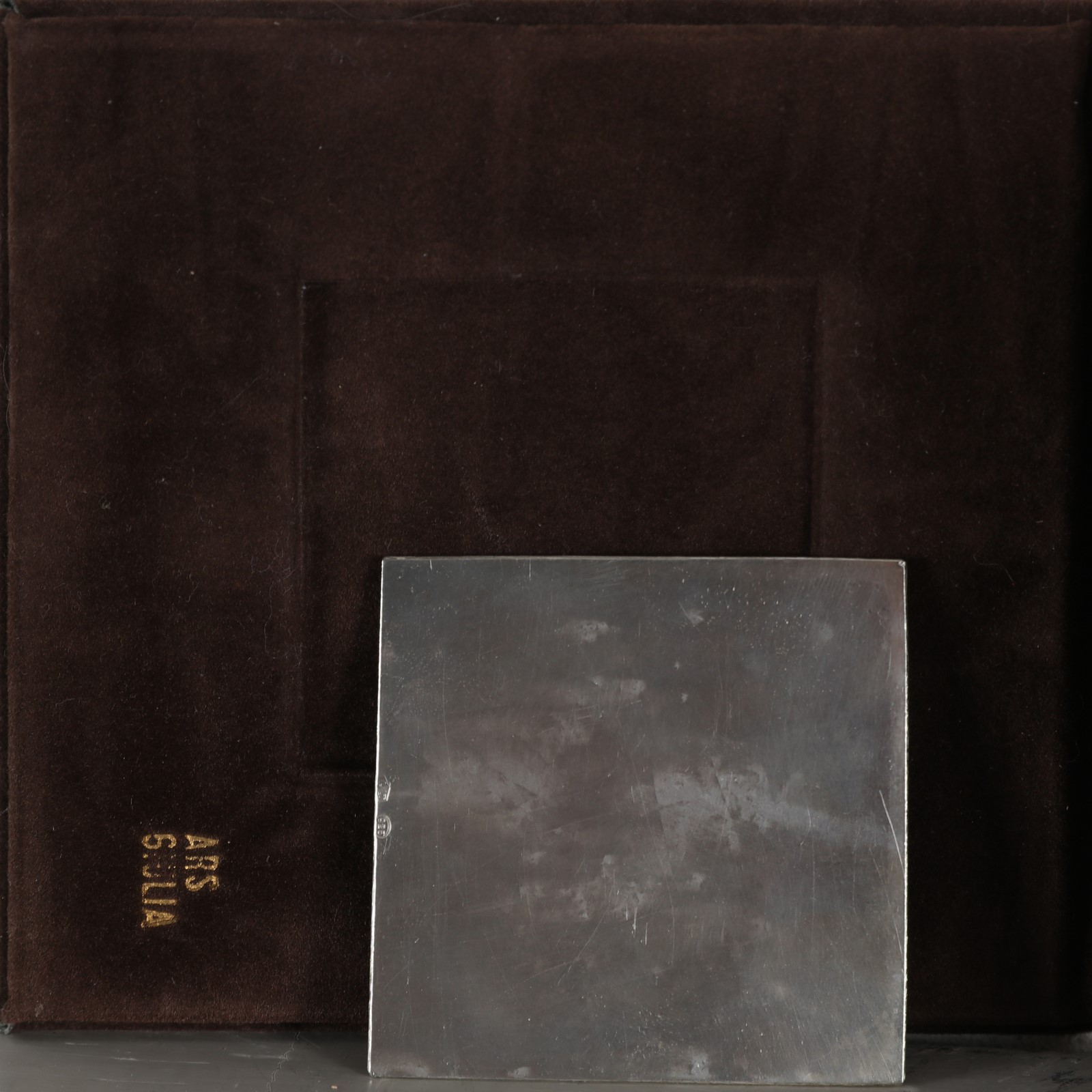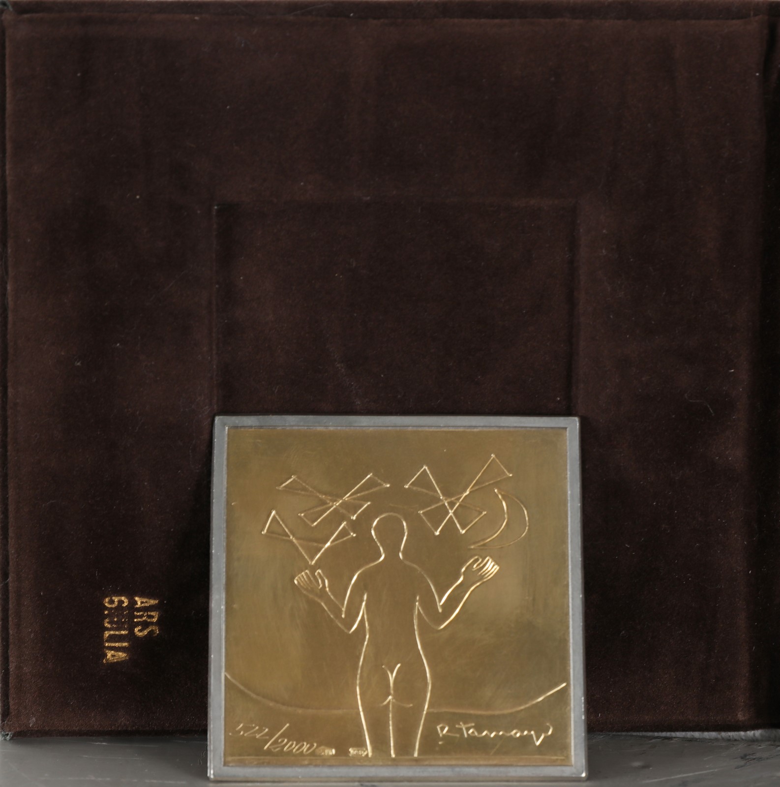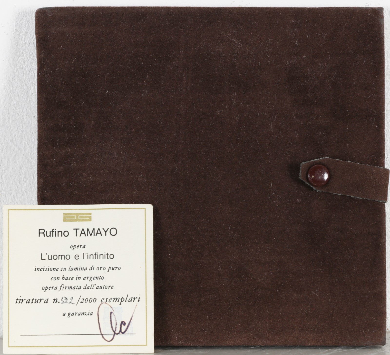 TAMAYO RUFINO (1899 - 1991) L'uomo e l'infinito. . Incisione su lamina. Cm 7,00 x 7,00. 522/2000. Tiratura e firma incise in basso. Lamina in oro puro con base in argento.