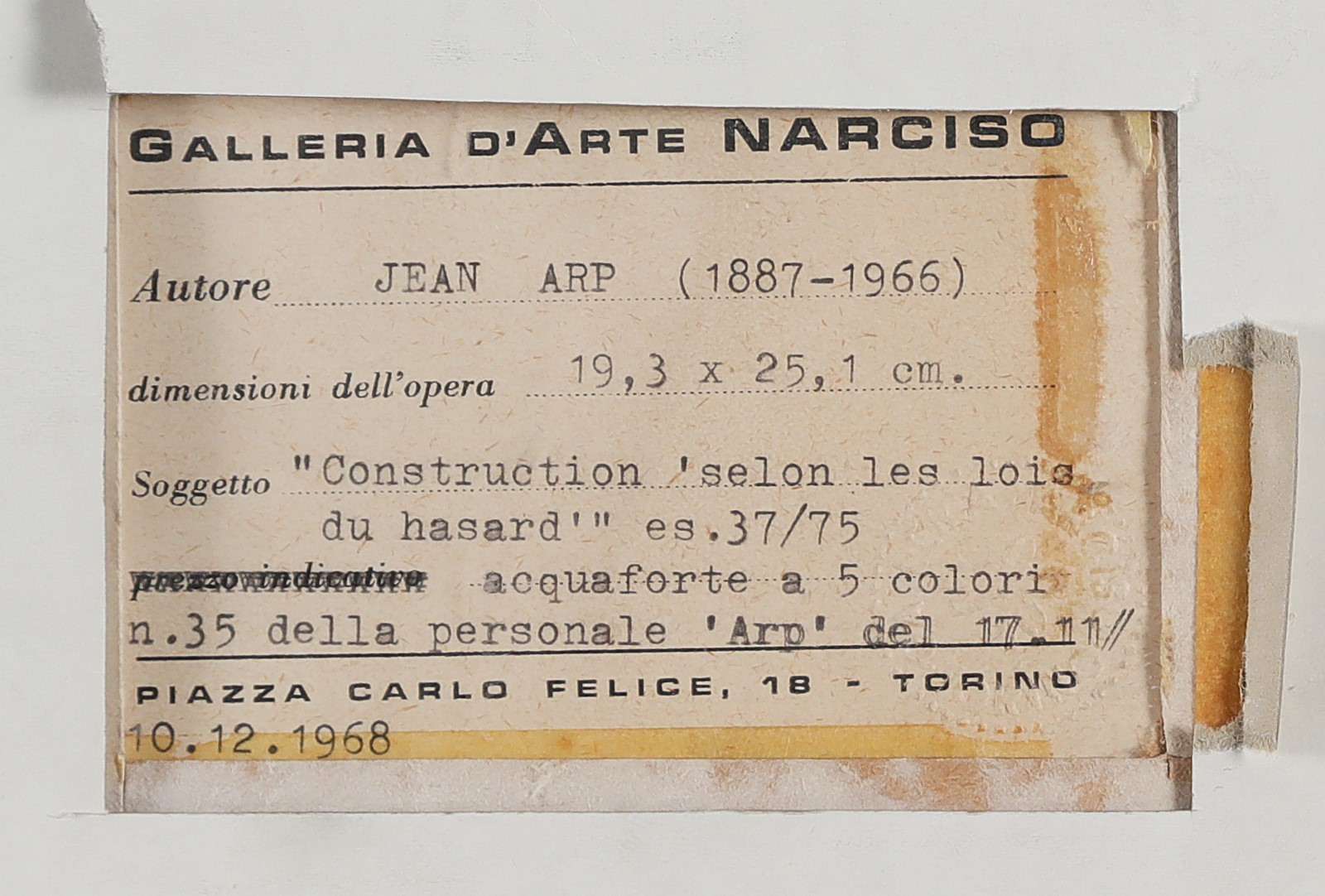 ARP HANS JEAN (1886 - 1966) Construction selon les lois du Hasard. Etching. Cm 21,00 x 28,00. 37/75. Signature and run down in pencil. At the rear descriptive cartouche by the Galleria D'Arte Narciso, Turin.. Cornice presente