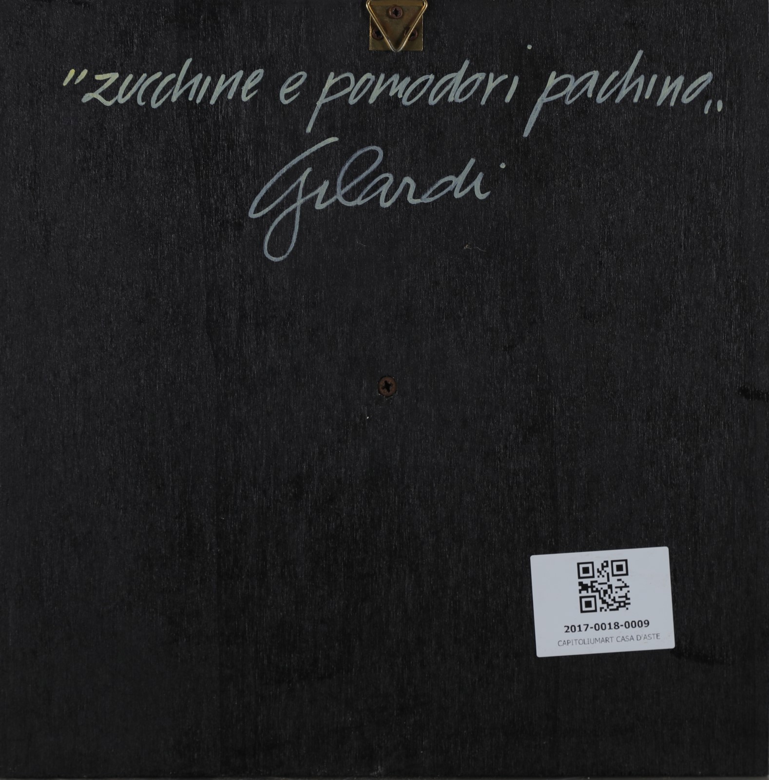 GILARDI PIERO (n. 1952) Zucchine e pomodori pachino. . Poliuterano espanso. Cm 30,00 x 30,00. Al retro titolo e firma. Autentica dell'artista su fotografia. . Cornice presente