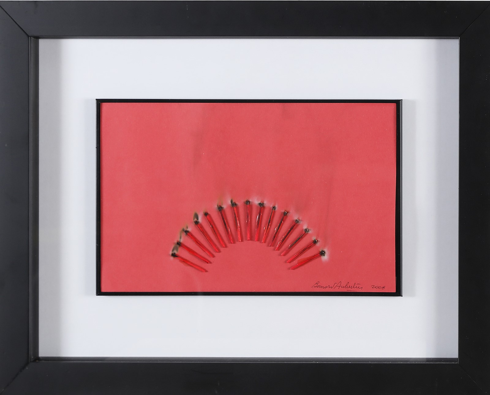 AUBERTIN BERNARD (1934 - 2015) Senza titolo. . 2008. Fiammiferi bruciati su carta. Cm 35,00 x 21,00. Firma e anno in basso a destra. Autentica dell'artista su fotografia. . Cornice presente