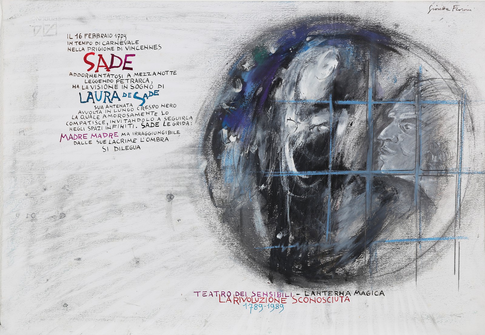 FIORONI GIOSETTA (n. 1932) Theatre of sensitive - magic lantern, the unknown revolution. 1989. Mixed media on paper. Cm 47,00 x 31,00. Signed upper right. The work is from a series of about sixty cartons (numbered at the back) of different sizes and different subjects, executed in two hands (images Giosetta Fioroni and written Guido Ceronetti) for the preparation of the exhibition-show "The Unknown Revolution" held at the ex-convent of the Carmelites, Dogliani (CN), in 1989, by the Guido Ceronetti company, Teatro Dei Sensibili.