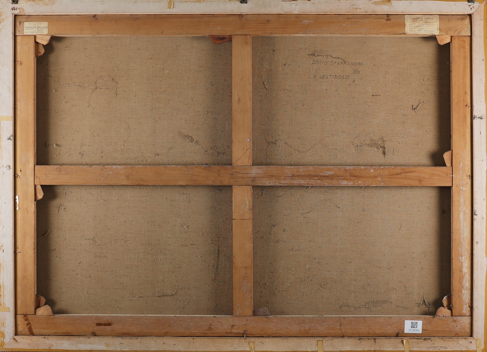 ATTILIO STEFFANONI (n. 1938) Vestibule. 1970. Oil on canvas . Cm 140,00 x 100,00. Signature and year on the bottom right. At the back title, signature, year and Galerie Tardy, Enschede label.. Cornice presente