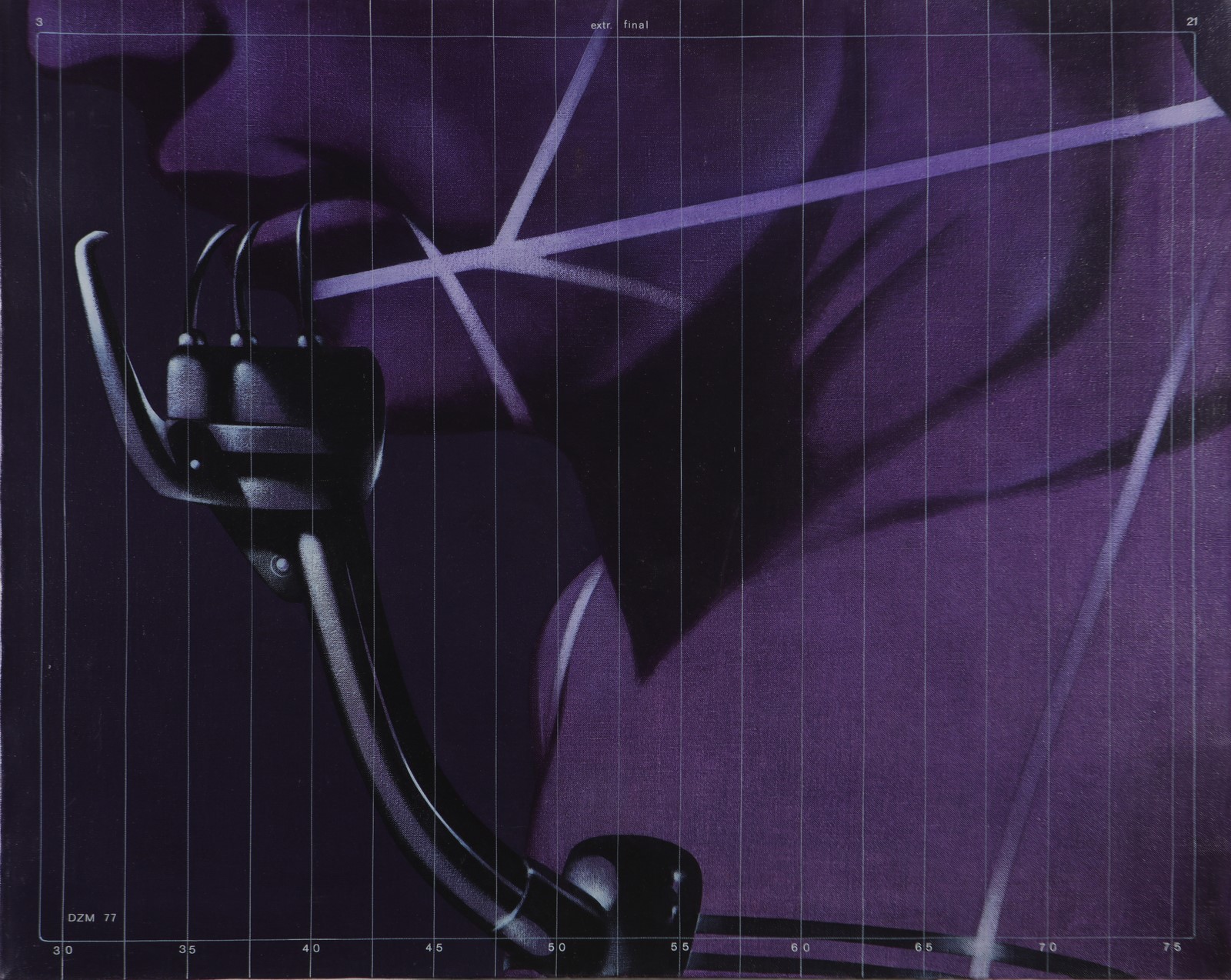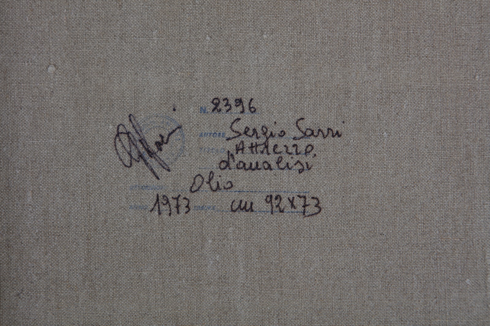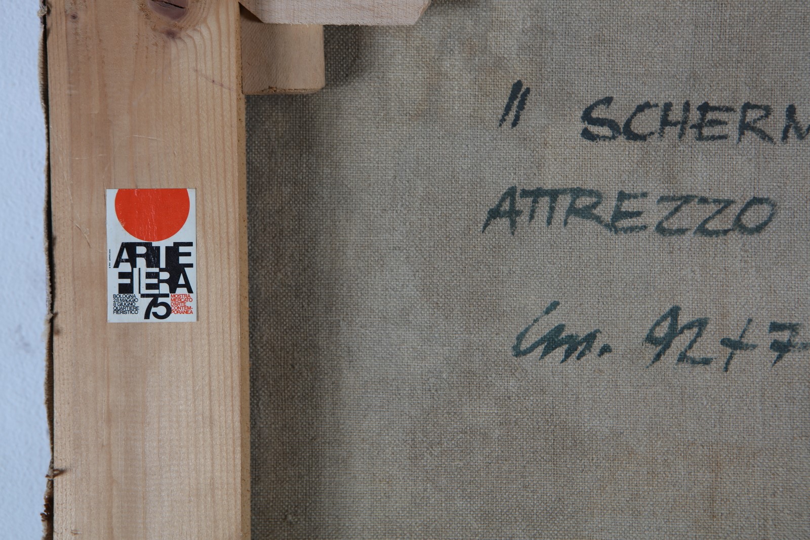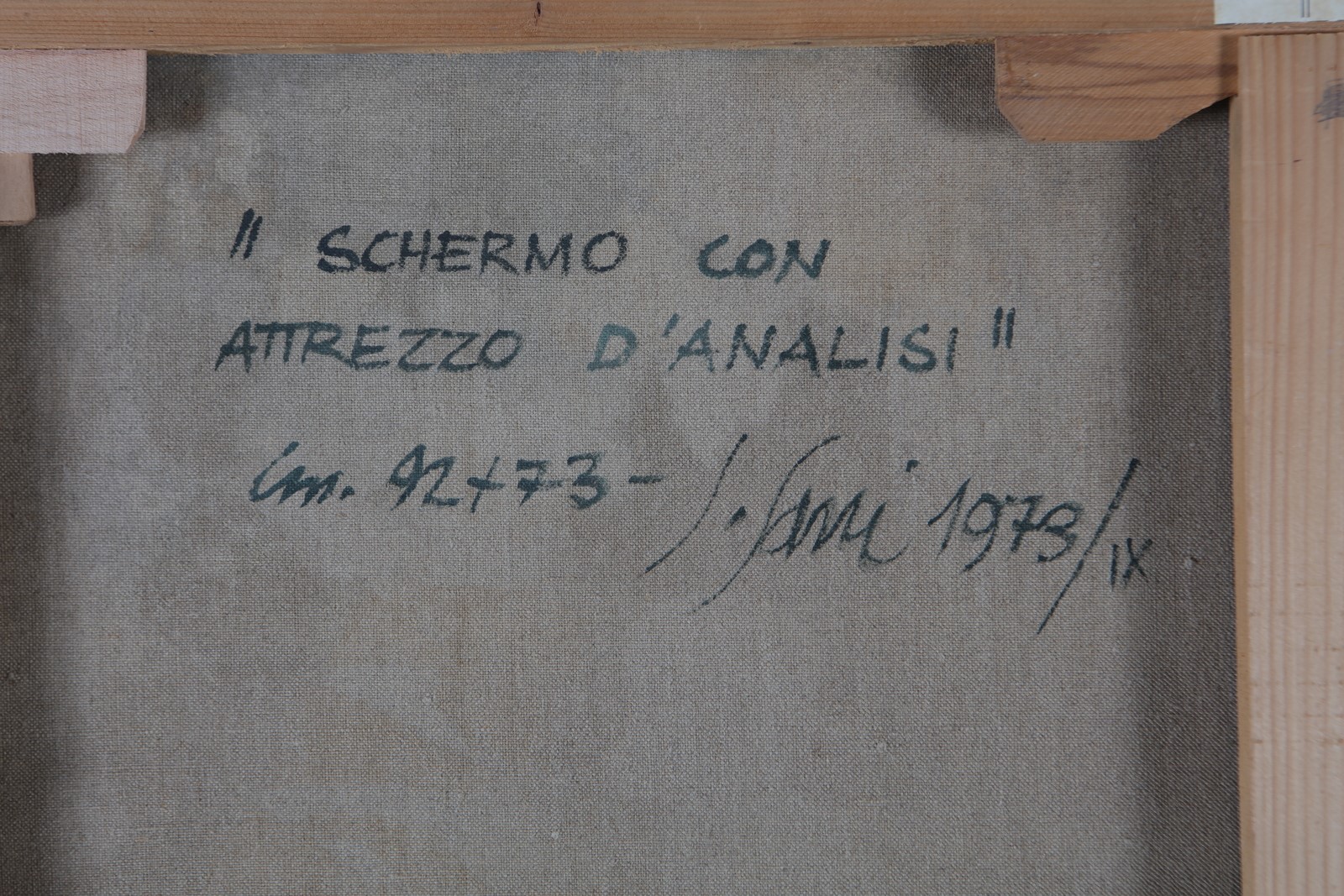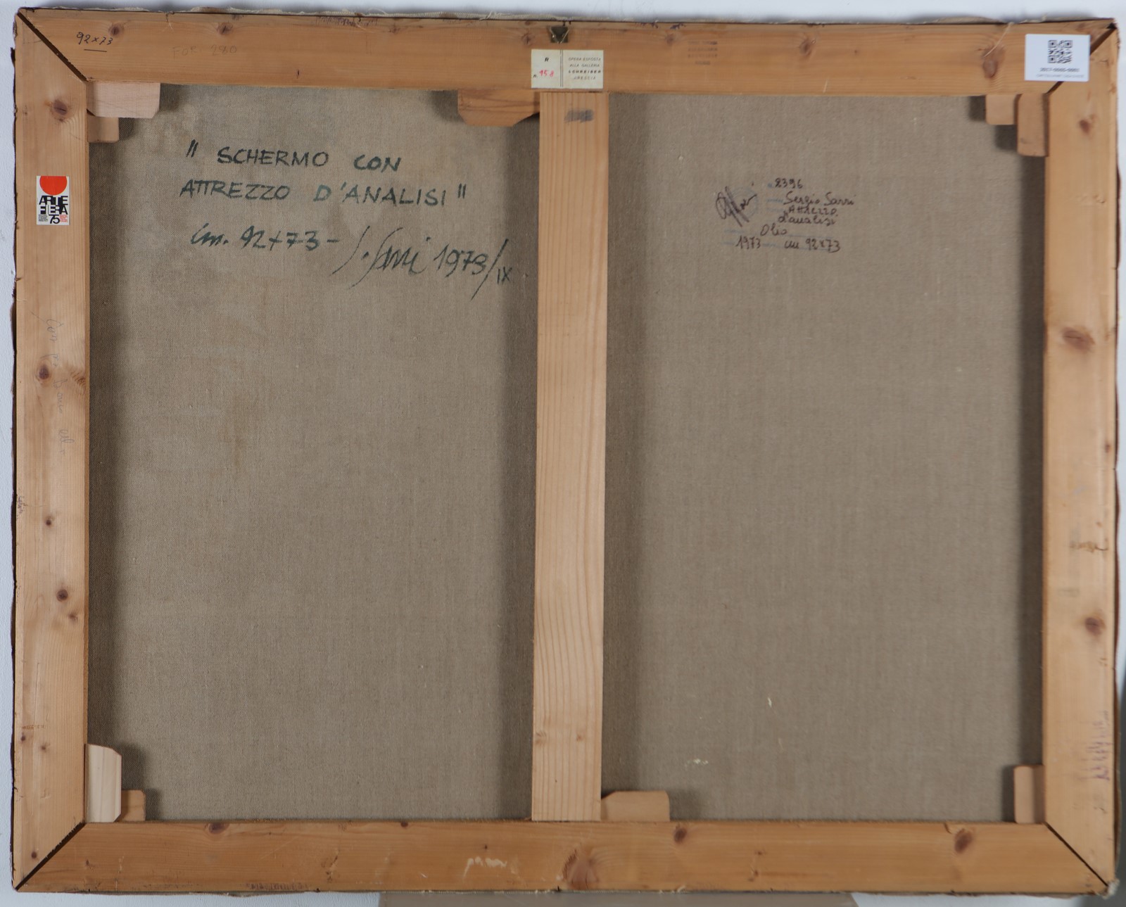SARRI SERGIO (n. 1938) Schermo con attrezzo d'analisi. 1973. Oil on canvas . Cm 91,00 x 73,00. Title, signature and year at the back. Schreiber Gallery, Brescia, stamp at the back.