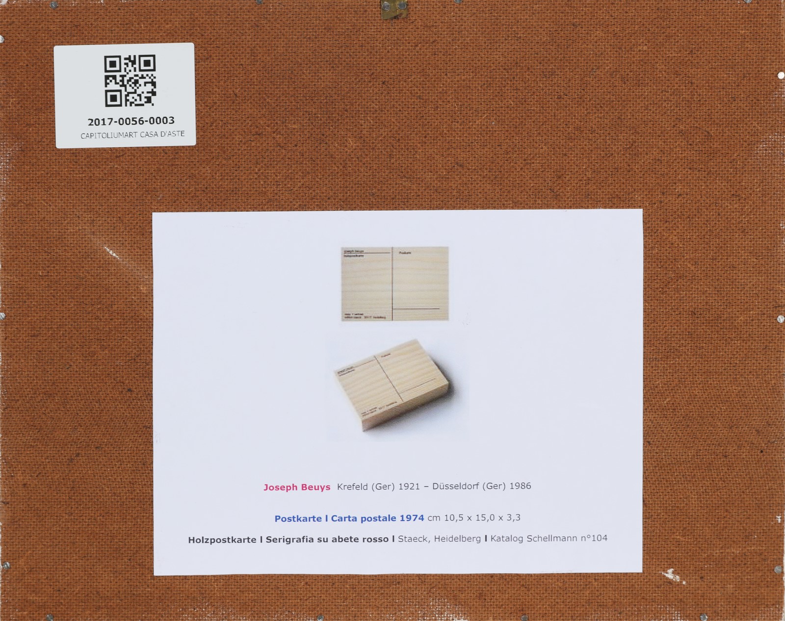 BEUYS JOSEPH (1921 - 1986) Postkarte. 1974. Silkscreen print on wood.. Cm 15,00 x 10,50 x 3,30. . Cornice presente