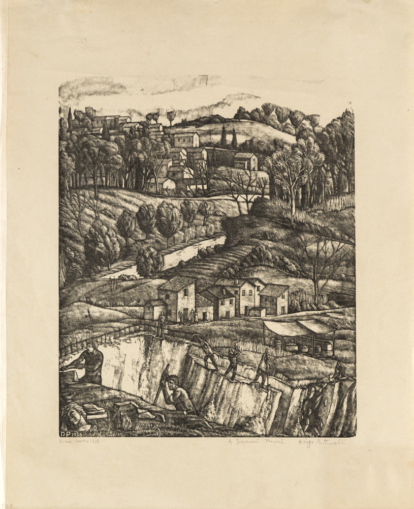 Diego Pettinelli SENZA TITOLO - Xilografia, cm 42x35,3, Firma su lastra "DP 1935". Firma, data e dedica a matita "Roma 1935, a Giovanni Prini, Diego Pettinelli".