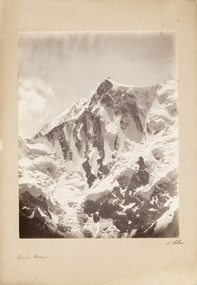 Vittorio Sella PUNTA GNIFETTI (TELEFOTOGRAFIA) DAL COLLE DEL MONTE MORO - Stampa con aristotipo su carta, cm 34x24 foglio (cm 24,5x19,5 foto). Firma "V.Sella" in basso a destra. Timbro "Vittorio Sella Biella" in basso a sinistra. Opera realizzata nell'Agosto del 1895. Certificato di autenticità rilasciato dalla Fondazione Sella Onlus, Biella