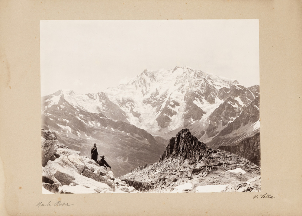Vittorio Sella MONTE ROSA DAL COLLE DEL MONTE MORO - Stampa con aristotipo su carta, cm 24x34 foglio (cm 19,5x24,5 foto). Firma "V.Sella" in basso a destra. Opera realizzata nell'Agosto del 1895. Certificato di autenticità rilasciato dalla Fondazione Sella Onlus, Biella