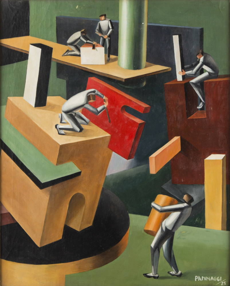 Ivo Pannaggi I COSTRUTTORI - Olio su cartone, cm 49,7x39,7, Firmato e datato in basso a destra "Pannaggi '25". Certificato di autenticità rilasciato da Maurizio Calvesi in data 20 Giugno 2013.