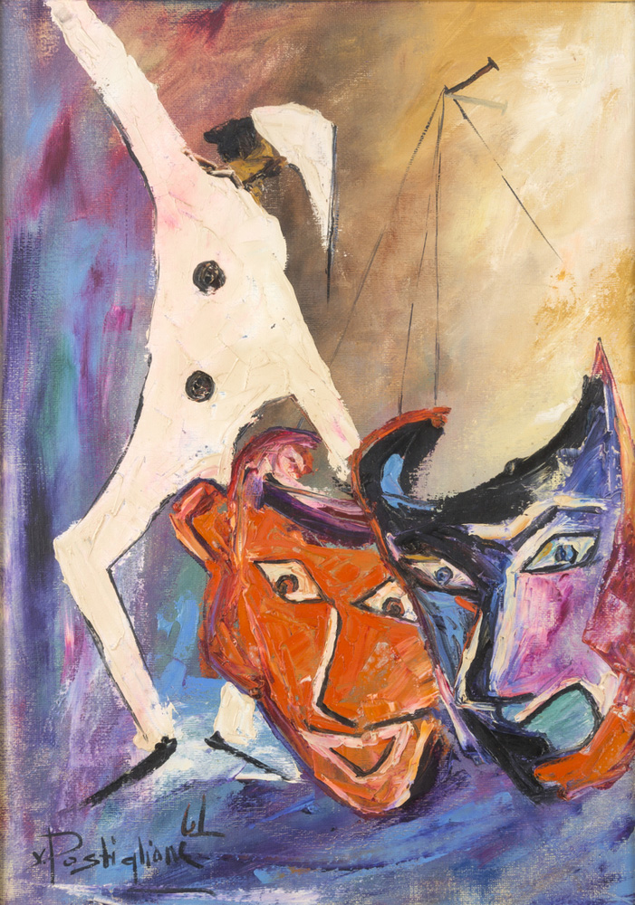 Savatore Postiglione MASCHERE - Tecnica mista su tela, cm 70x50, firmato in basso a sinistra "Postiglione".