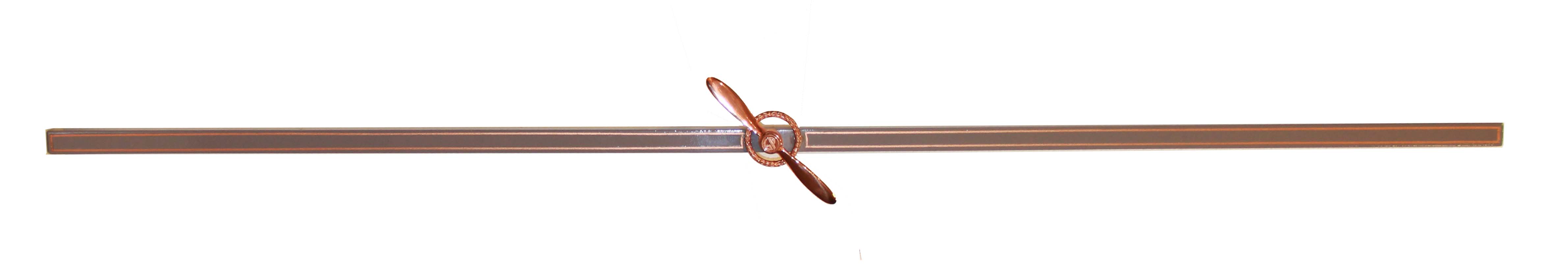 Gianni PIACENTINO Coazze 1945 Small decorated bar with crown and propeller, 1972 poliestere verniciato rivestito in legno, rame, ottone painted polyester-coated wood, copper-plated brass cm 7.5×90×2.6 Esemplare unico Unique piece Autentica dell’artista su fotografia, datata 12/07/2003 Certificate issued by the artist, dated 12/07/2003 Firma, data ‘Gianni Piacentino, 1972’ (al retro) Signed, dated ‘Gianni Piacentino, 1972’ (on the reverse)