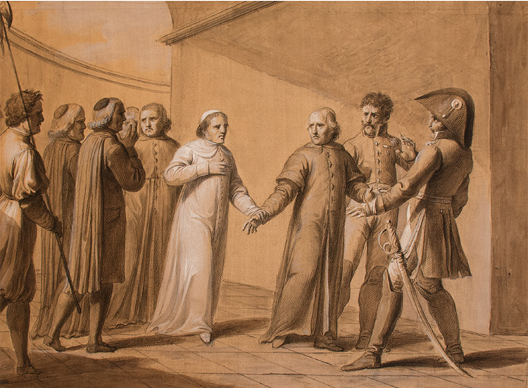 Scuola romana Coppia di disegni raffiguranti "Storie di Pio VII": A "Firma del Concordato da parte di Pio VII"; B "Arresto di Pio VII da parte dei soldati di Napoleone". I metà XIX sec. A: penna, biacca, matita su carta, 36 x 48 cm; B: penna, matita, lumeggiature di biacca su carta, 32 x 42 cm. Scuola romana.