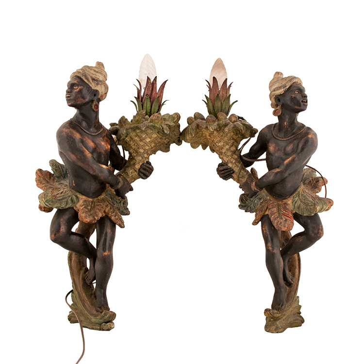 Due coppie di lampade con figura di moro. II metà XIX sec. Legno dipinto. A: 47,5 x 29,5 x 17,5 cm; B: 45 x 27 x 17 cm; C: 45 x 27 x 17 cm; D: 45 x 27 x 17; ambiente veneto.