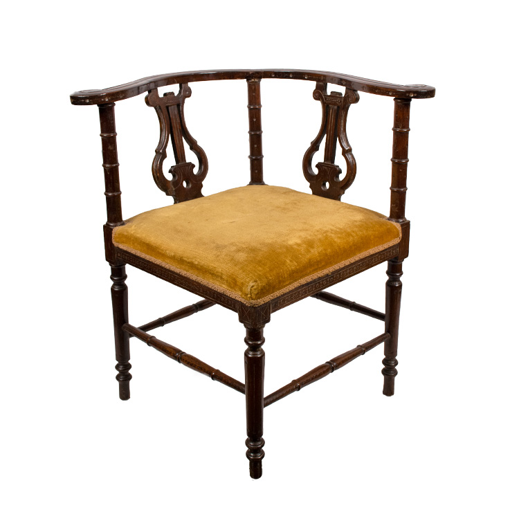 Coppia di Poltroncine angolari inglesi con schienale a lira. II metà XIX sec....