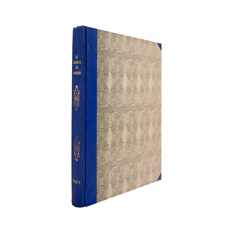 16 volumi (A-R) della Domenica del Corriere. A: 1899; B: 1900; C: 1901; D: 1906; E: 1907; F: 1909; G: 1913; H: 1914; I: 1917: L: 1918; M: 1922; N: 1926; O: 1927; P: 1935; Q: 1937; R: 1940. A-B-C: 37,5 x 29,5 cm; D-R: 39,5 x 28,5 cm.