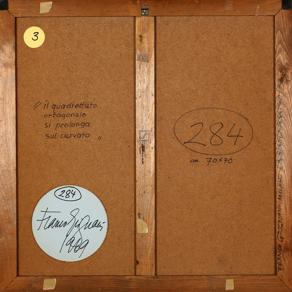 FRANCO GRIGNANI 1908 - 1999 Dissociazione dal bordo ( Il quadrettato ortogonale si prolunga sul curvato), 1969 Acrilico su cartone schoeller, cm. 70 x 70 Firmato e datato sul retro Prov. Collezione Privata