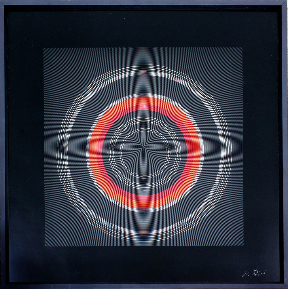 MILAN DOBES 1929 Ottico cinetico, 1972 Assemblaggio, vetro serigrafato e tavola serigrafata, cm. 50 x 50 x 5 Firmato e datato in basso a destra Prov. Collezione Privata