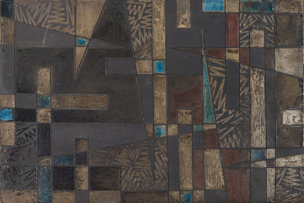 Semirefrattario inciso a fresco e dipinto con colori raku, cm. 42,5 x 28,5