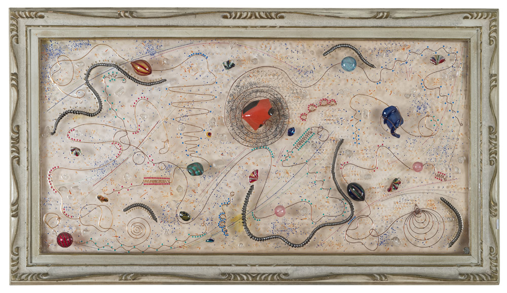 COMPOSIZIONE IN PASTA DI VETRO con applicazioni a caldo di oggetti in metallo, ferro e vetro soffiato.