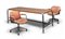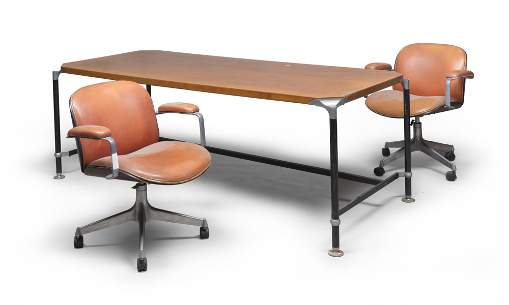 Tavolo da lavoro con piano in legno e struttura in alluminio con due poltroncine in pelle, cromo e legno, 1958.