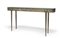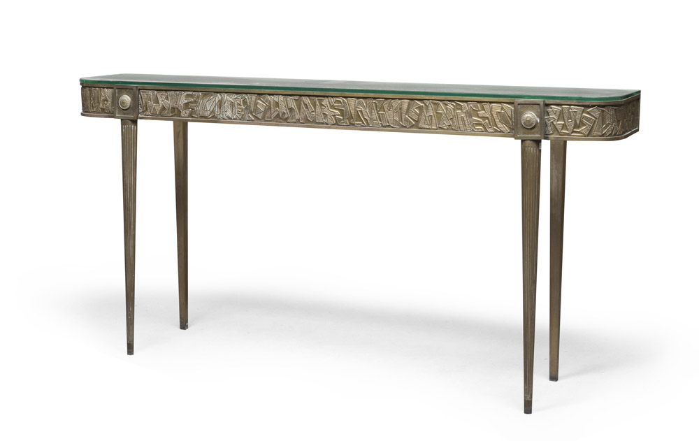 Consolle con ripiano in cristallo e gambe in metallo dorato con il bordo decorato a sbalzo con motivi geometrici, 1958-60.