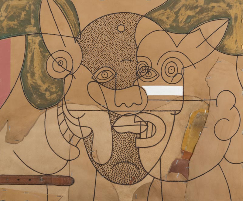 Concetto Pozzati (Vò di Padova 1935) Burattini Frontali, 2004, Olio e acrilico su cuoio pirografato montato su tavola, cm. 50x60 Sul verso: firma, data, titolo e Archivio n° 1744. Bibliografia: Elisabetta Valenza, Riccardo Rossetti "Concetto Pozzati - Archivio Generale - II Tomo", Maretti editore, 2008, pag. 290, Archiviato con il n° 1744. Autentica dell'Archivio Generale Concetto Pozzati su foto con Archivio n°1744/07.