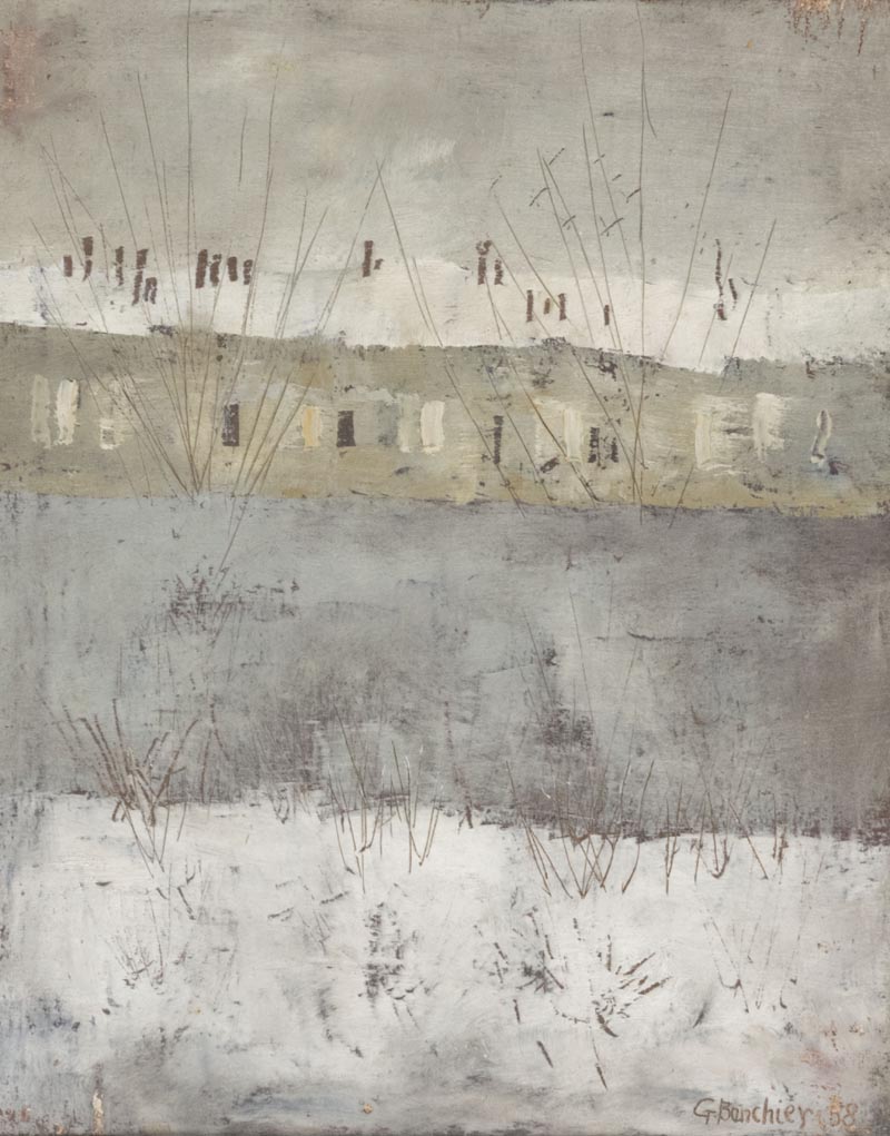 Giuseppe Banchieri (Milano 1927 Poveromo (Ms) 1994) Paesaggio n° 12, 1958, Olio su tela, cm. 30x24 Firma e data in basso a destra; Sul verso: titolo.