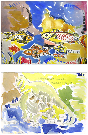 LUIGI SCALI Pisa 1931 – Pisa 2002 Senza titolo 1971 Tec. mista su cartoncino 23 x 34. Firma e data in b. a d. Dinosauri - Triceratope contro tirannosauro rek 1978 T.m. su cartoncino 25 x 35. Firma e data in b. a d., titolo in b. a s. e in a. a d. B.A.: 50
