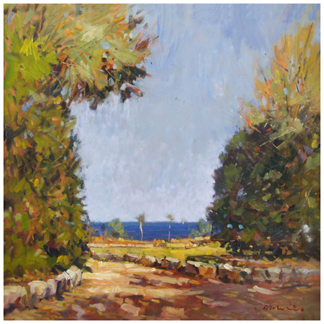 GIOVANNI DEL VIVO Livorno 1956 Domenica mattina sul mare ad Antignano olio su masonite 50 x 50. Firma in b. a d.; sul verso firme, località e titolo + etichetta “Certificato di autenticità” con scritta di partecipazione “Premio Ardenza”. B.A.: 100