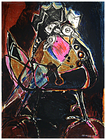 LUCIANO MINGUZZI Bologna 1911 – Milano 2004 Senza titolo Litografia a colori es.48/99. Firma in b. a d. + timbro a secco dell’autore in b. a s. (63 x 47,5 foglio e lito.) B.A.: A OFFERTA