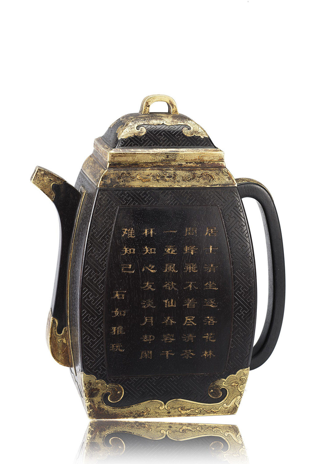 Teiera con coperchio in legno zitan con montatura e inserti in bronzo dorato e con incisa iscrizione calligrafica poetica su fondo con motivi geometrici Cina, fine sec. XIX-inizio sec. XX A zitan teapot and cover, with gilt bronze mounts decorated with floral motifs, incised with a poetic inscription on a geometric-patterned ground China, late 19th-early 20th century (h. 24,5 cm.)