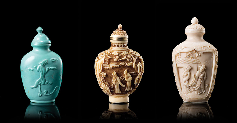 Gruppo d tre snuff bottles, in turchese e avorio intagliato Cina, sec. XX Provenienza: collezione privata milanese. Three snuff bottles in turquoise and carved ivory China, 20th century Provenance: a Milanese private collection. (h. max. 8 cm.)